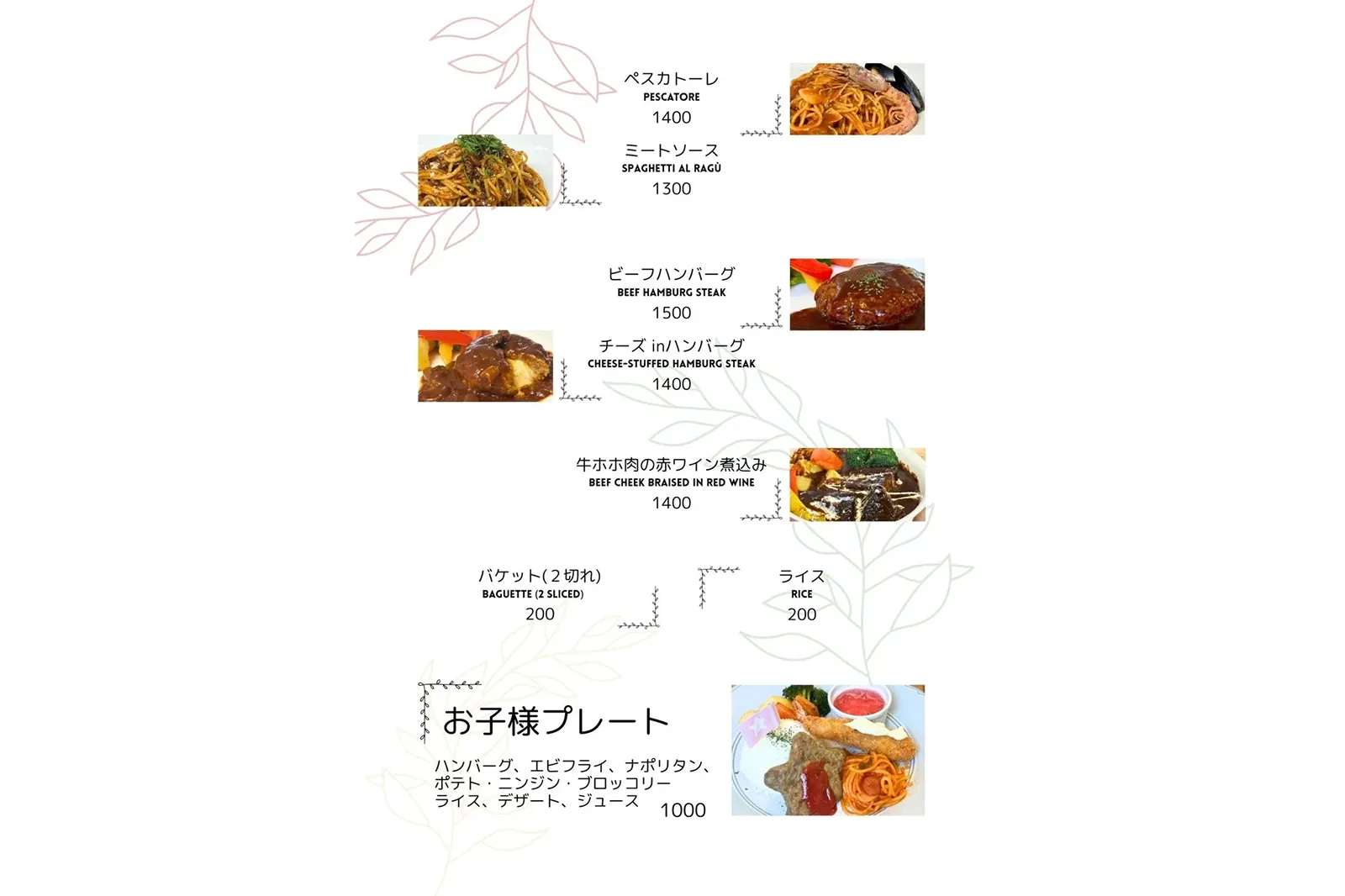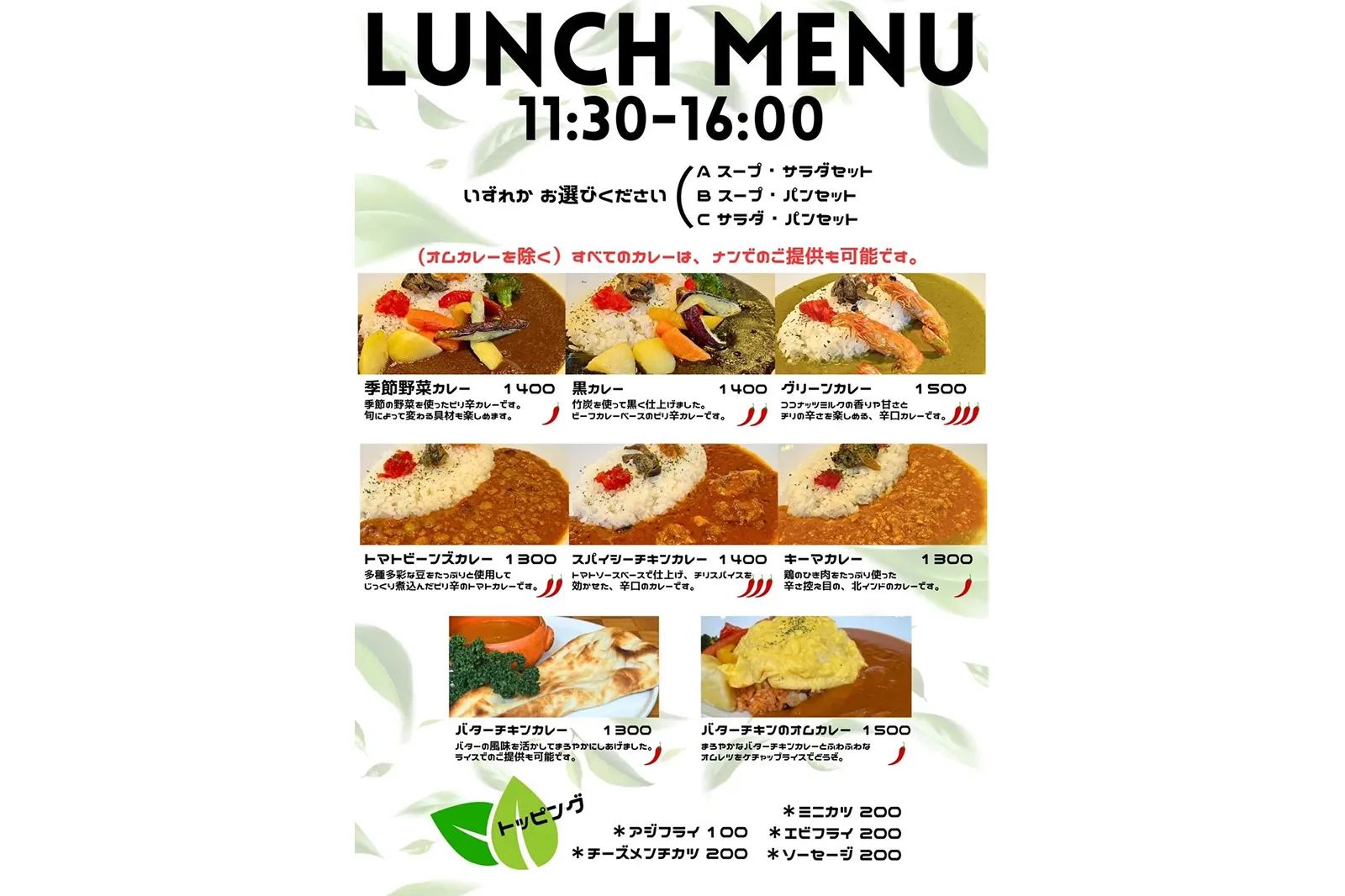 ランチメニュー詳細(メイン料理・本日のスープ・本日のデザート・ドリンク)は、店舗にてメニューをご確認ください。